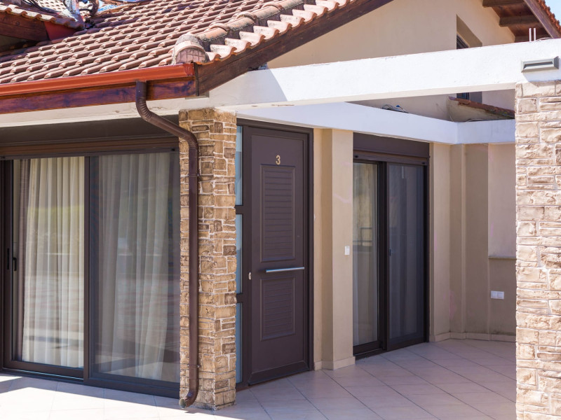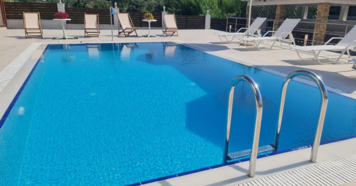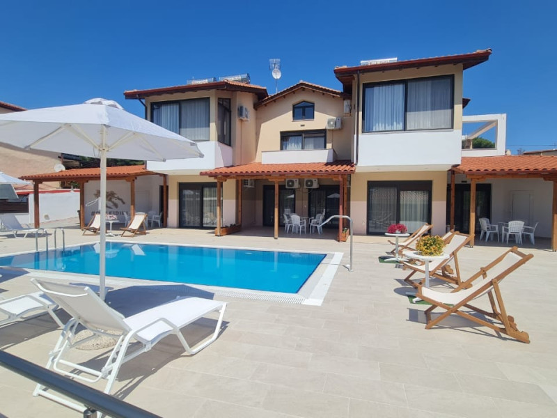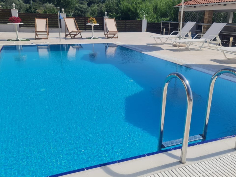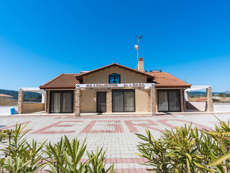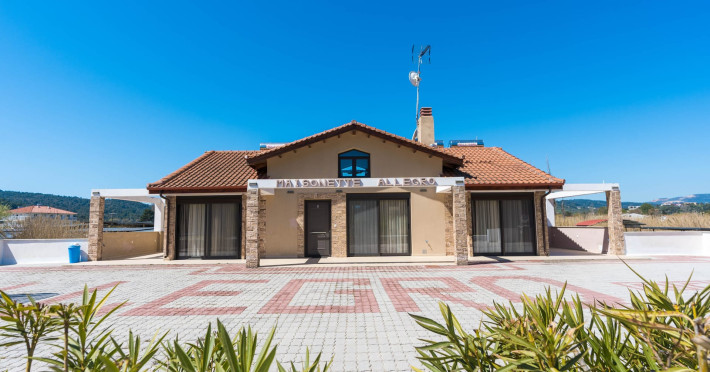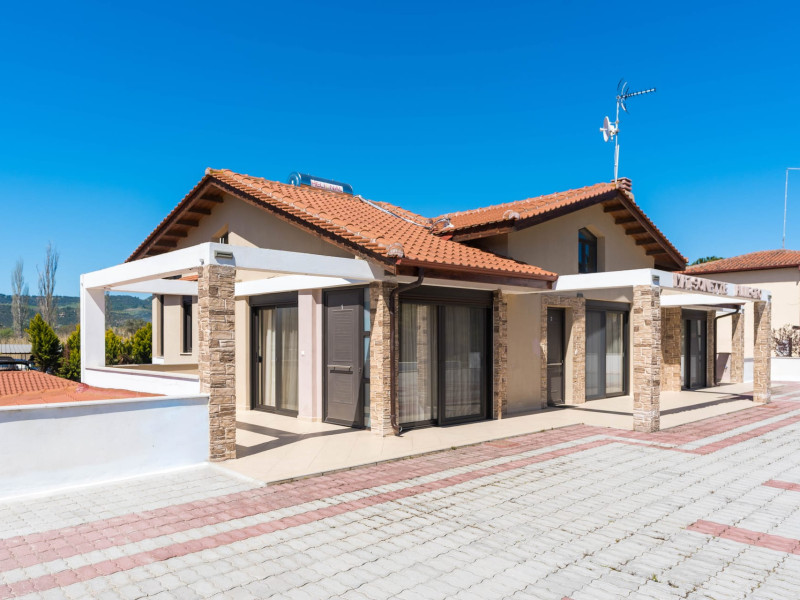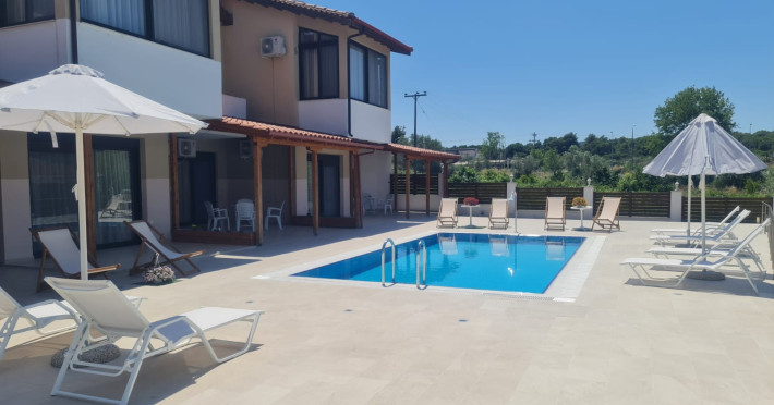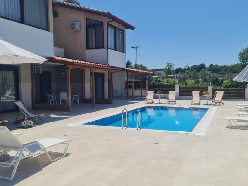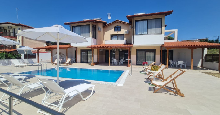 Allegro maisonettes are situated in Ormos Panagia, Sithonia. Only 250m from the largestand longest sandy beach, Trani Ammouda, it turns it the ideal place to spend your summer holidays. The two-storey maisonettes are equipped with kitchen, dining area, WC, bathroom, two bedrooms and laundry room with ironing board. Each maisonette can accommodate up to 6 or 7 people, as there is a pull-out sofa on the top floor. Also available are a/c, LCD TV, free WI-FI, closets, one double bed and two twin beds. The spacious backyard terrace and the pool are accessible directly from the ground floor rooms. Sunbeds & umbrellas are at the disposal of customers, as well as a trampoline for our younger guests. At the BBQ area near the pool there is a large wooden table and benches. Parking is also available. Shops, bars and restaurants are in a distance of 100m. The SKG airport is 92km away.