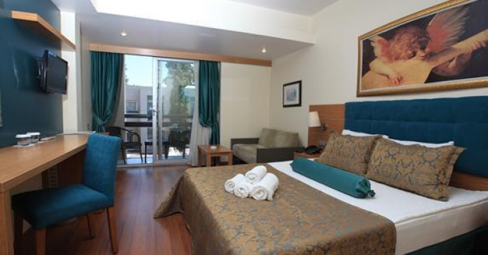 ADDITIONAL INFORMATION; As you take a drink in the lobby bar its restful atmosphere will caress as you enjoy with each sip of acooling drink. Or you could feel relaxing pleasure on the cushions next to beach.WINING amp; DINING;Half board service consists Mediterranean cuisine breakfast and dinner in buffet form and additionally,payable creative lunch menu. Vegetarian menu is also available at the buffet. In the mid and high season the dinner is served accompanied live music in 3 days a week. HEALTH amp; SPORT;Turkish bath, Jacuzzi, massage and the shock bath are available for a local charge. Gym hall providesalso table tennis. Water sports organized at the beach by the local companies.FACILITIES;24 hrs Room Service, Meeting Rooms (total cap:50), Ball and Conference Hall (total cap:300), Health Cabin, Laundry Service, WLAN Internet Access, Free Parking Lot, Generator, Money Exchange.
