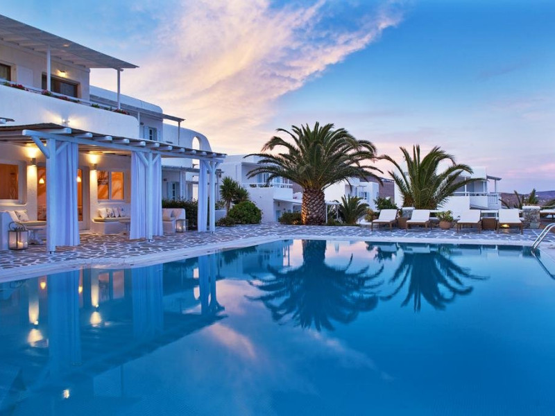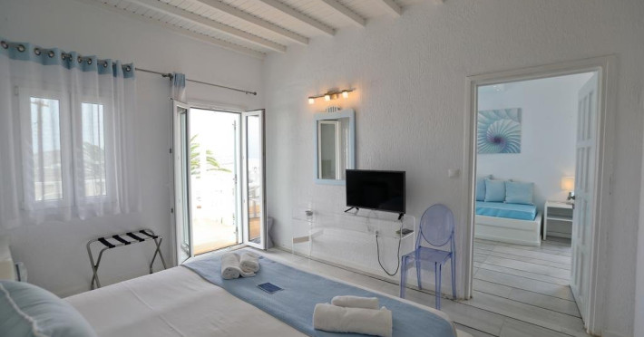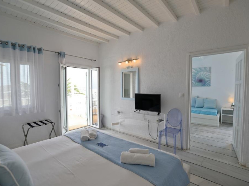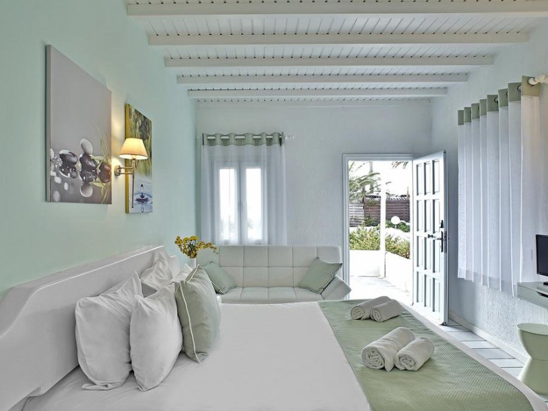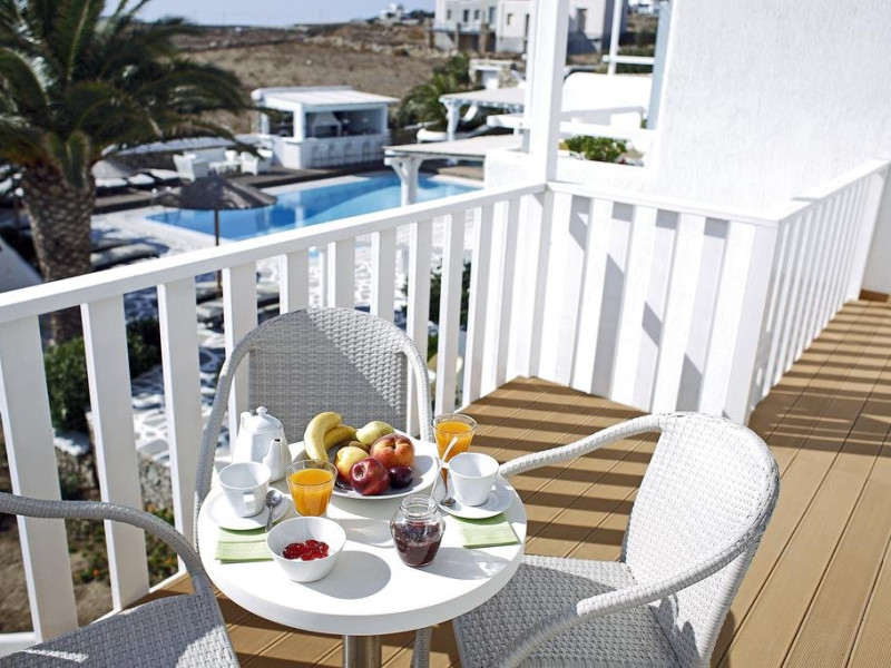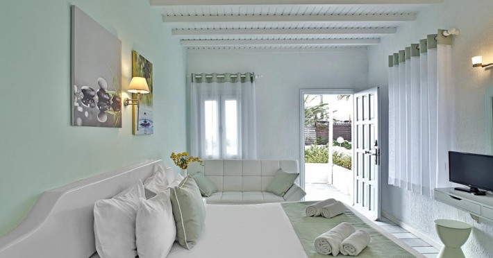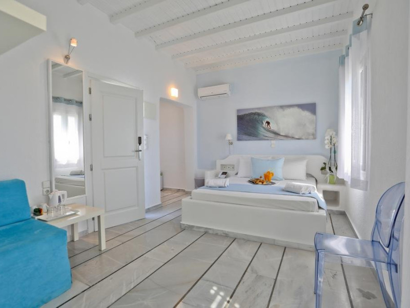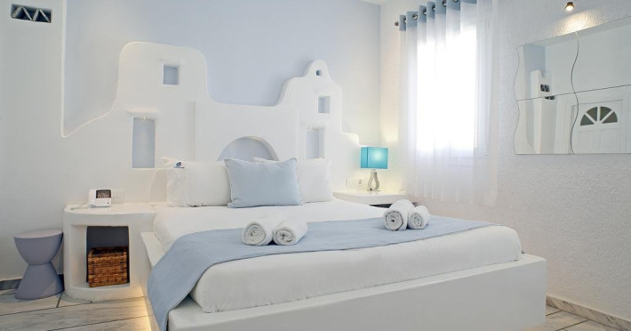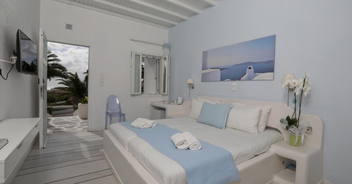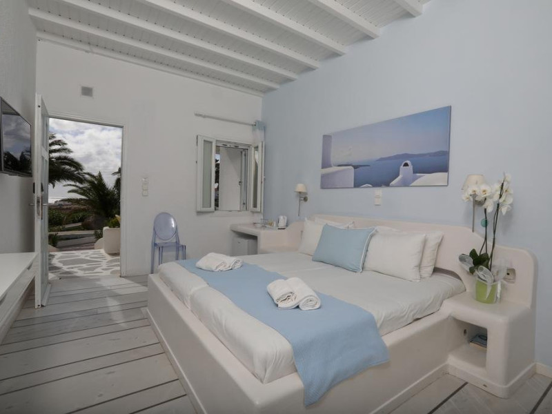 Descriere: hotel renovat recent foarte aproape de cel mai lunga plaja a insulei in Kalafati, una din cele mai calme si relaxante statiuni din Mykonos Localizare: in apropierea plajei din Kalafati, la 12 km de capitala insulei, Mykonos Town si la 16 km de aeroport. In apropierea hotelului se afla o statie de autobuz pentru accesul facil catre alte zone ale insulei Facilitati hotel: hotelul Anemoessa ofera oaspetilor sai piscina, bar la piscina, 2 restaurante, bar, salon TV, internet wireless gratuit, sala jocuri, baby-sitter, parcare, inchirieri auto, biserica Facilitati camere: hotelul Anemoessa are urmatoarele tipuri de camere: standard, superior si suite. Camerele dispun de baie cu dus, aer conditionat, minibar, TV satelit, telefon, accesorii pentru toaleta, uscator de par, papuci, balcon sau terasa cu vedere la mare Plaja: de nisip la aproximativ 150m de hotel, sezlonguri si umbrele contra cost, posibilitate pentru sporturi nautice. Website: www.anemoessa.com