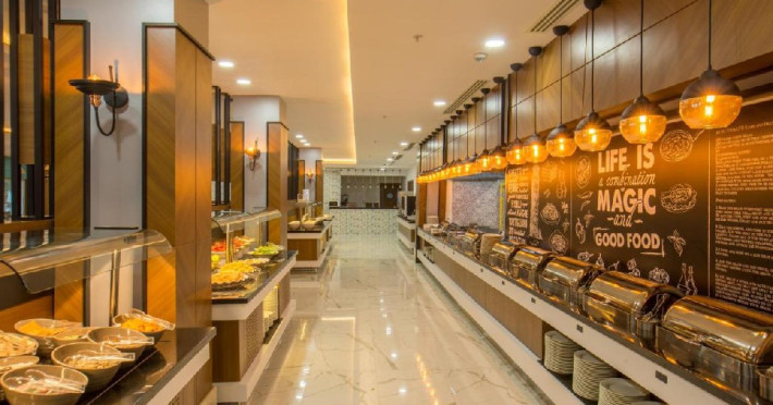 Facilitati hotel: Hotelul pune la dispozitia oaspetilor: restaurant bufet, patiserie, snack-bar, lobby bar, pool bar, beach bar, piscina exterioare, piscina cu tobogane, piscina interioara, piscina pentru copii, centru Spa, sala fitness, aerobic, volei pe plaja, polo pe apa, darts, tenis de masa, animatie, spectacole, muzica live, loc de joaca, miniclub.