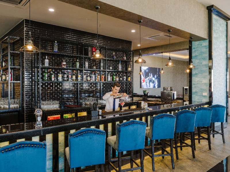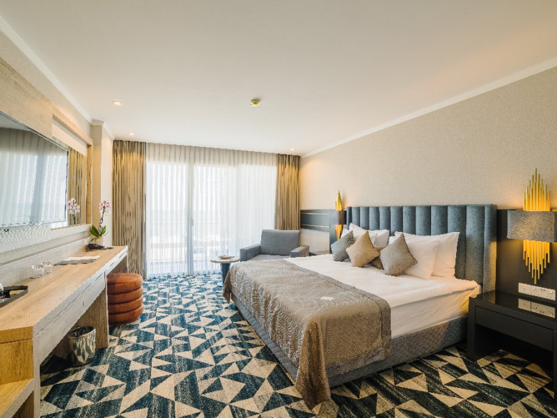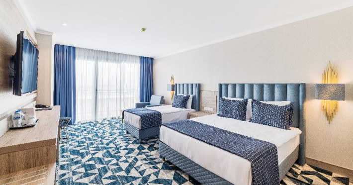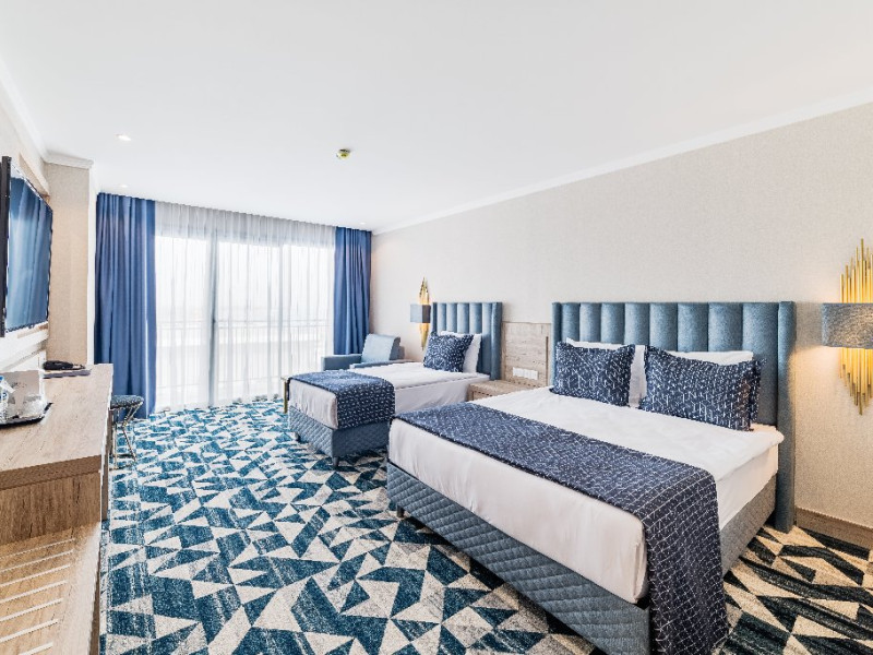 Dotari camere: Camerele sunt dotate cu: balcon, aer conditionat, seif, internet wireless,dus walk in, papuci de acasa,halat de baie (family room) ,tv de 49 inch , cafetiera. Camerele standard, cu vedere partiala sau directa la mare au dimensiunea de 40mp si sunt echipate cu un pat matrimonial, un pat single si un sofe bed, potrivit pentru copii.