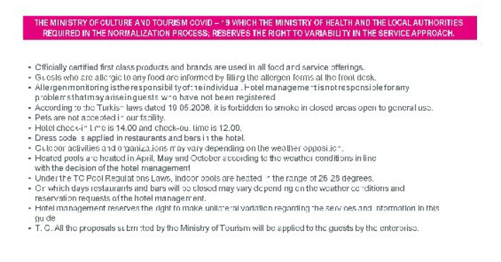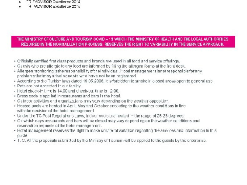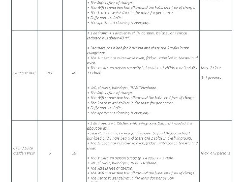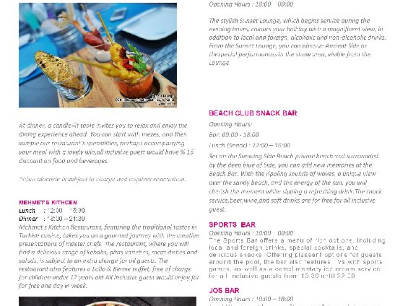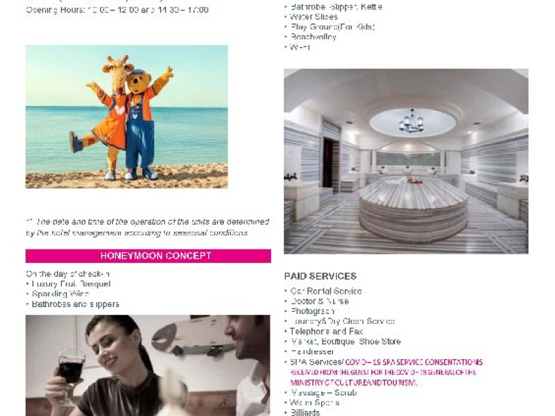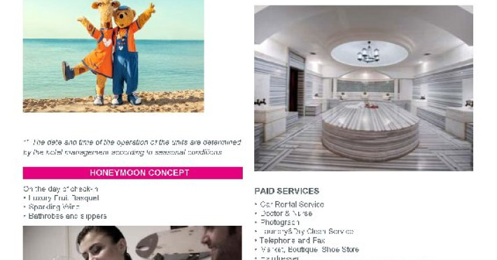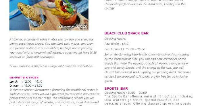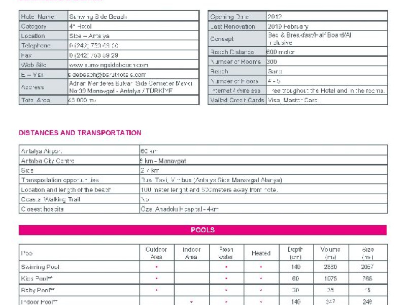 Descriere: Hotelul Barut Sunwing Side isi intampina oaspetii cu un concept special creat pentru rasfatul fiecarui membru al familiei. Ultima renovare a avut loc in 2019. Tip masa: all inclusive Localizare: In statiunea Side, la 60 km de aeroport si la 750 m fata de plaja. Plaja: privata cu nisip. Sezlonguri, prosoape de plaja si umbrelute incluse. Facilitati generale: receptie, lobby, WIFI gratuit in tot hotelul, piscina exterioara pentru adulti, piscina exterioara pentru copii, piscina interioara, tobogane, restaurant principal, restaurant a la carte, bar, pool bar, beach bar, animatie, aerobic, fitness, masa si teren de tenis, hamam. Dotari camere: dormitor, kitcheneta, baie cu dus, uscator de par, seif gratuit, set pentru ceai si cafea, Tv satelit, telefon, minifrigider. Servicii cu plata: spalatorie, telefon, rent a car, masaj, sporturi nautice, billiard, echipament de tenis. Facilitati copii: baby cot la cerere, loc de joaca pentru copii, miniclub, tobogane, patut pentru bebelusi, carucioare, leagane, scaune pentru restaurant, servetele umede. Pagina web: https://www.sunwingsidebeach.com/en Nota informativa: Pentru anumite facilitati din hotel sau din camera, hotelierul poate solicita taxe suplimentare. In momentul sosirii la hotel solicitati receptionerului sa va informeze cu exactitate asupra lor.