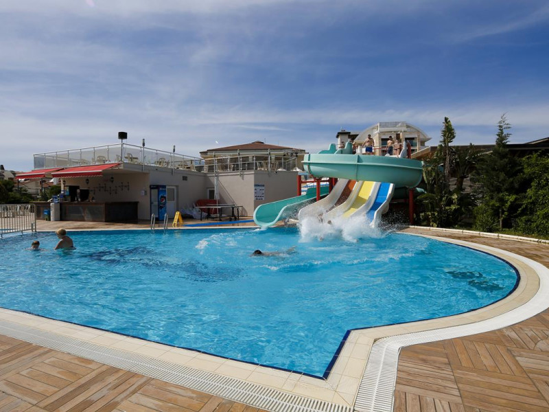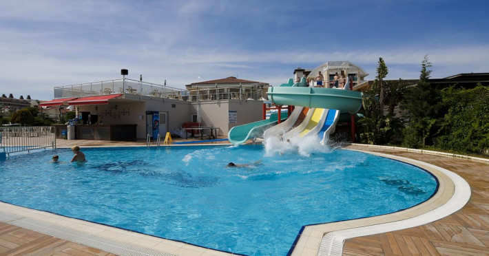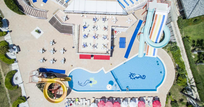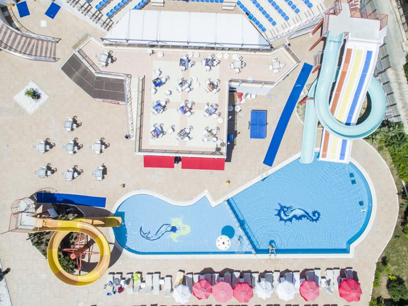 Copiii se pot distra la piscina special amenajată, prevăzută cu tobogane cu apă.
