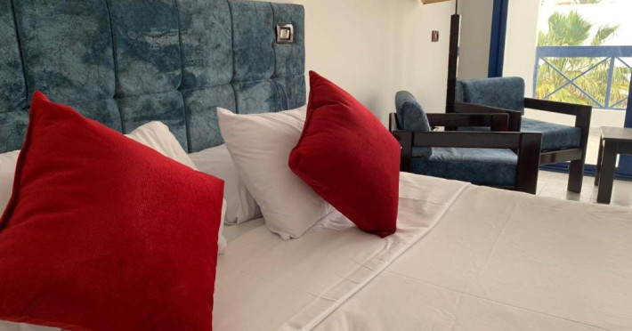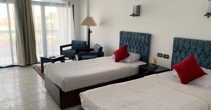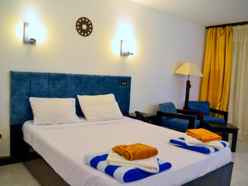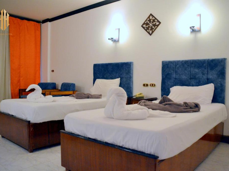The hotel El Khan Sharm Hotel*** is located in the vicinity of a private rocky beach. On the beach are sun loungers and cushions available. The seasonally air-conditioned halal hotel has a 24h reception (check-in is possible around the clock), a lobbThe hotel El Khan Sharm Hotel*** is located in the vicinity of a private rocky beach. On the beach are sun loungers and cushions available. The seasonally air-conditioned halal hotel has a 24h reception (check-in is possible around the clock), a lobby, internet access, cash machine, a first aid kit as well as parking spaces. In the outdoor area of the property you will find a supervised pool (open all year), where pool towels are available for free. For children there is also a separate childrens pool. Furthermore, outside you can find a terrace. You can store your valuables in the safe, and your luggage in the hotels storage room. For very young guests, highchairs can be provided. There is also a laundry service available at an additional cost to customers. For your comfort the hotel page will ensure you are looked after. Catering For the meals, there are a restaurant and the pool bar. Sports amp; Leisure For cyclists there is a storage room. Furthermore, various water sports such as diving are offered in the area. A sauna (extra fee) awaits you in the spa. In terms of adult entertainment, shows are organized in the evening. Additional information The hotel staff speak English, Italian, Russian and Arabic.