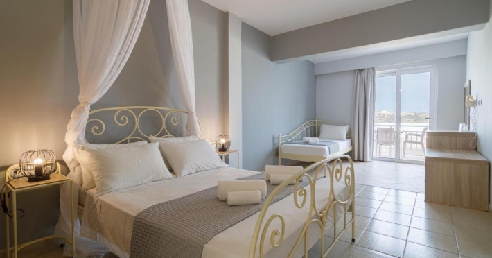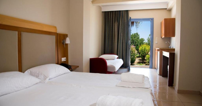 DOTARI CAMERE: Toate camerele sunt dotate cu aer conditionat, frigider si balcon mobilat, oferind privelisti la mare si sat. Acestea dispun de ferestre de la podea pana la tavan si mobilier simplu. Baia privata este echipata cu dus si uscator de par.