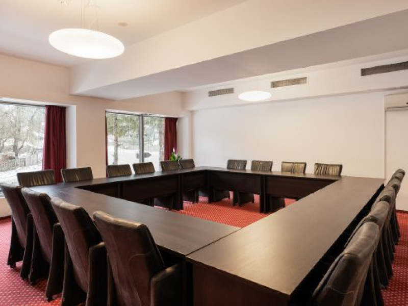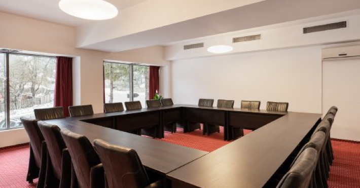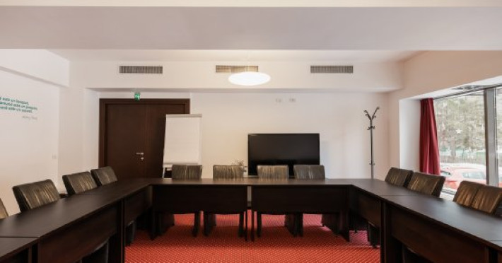 - Sala mica de conferinta (max 20 locuri) – ecran de proiectie, videoproiector, sistem sonorizare, flipchart, internet wirless