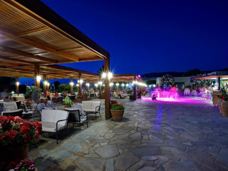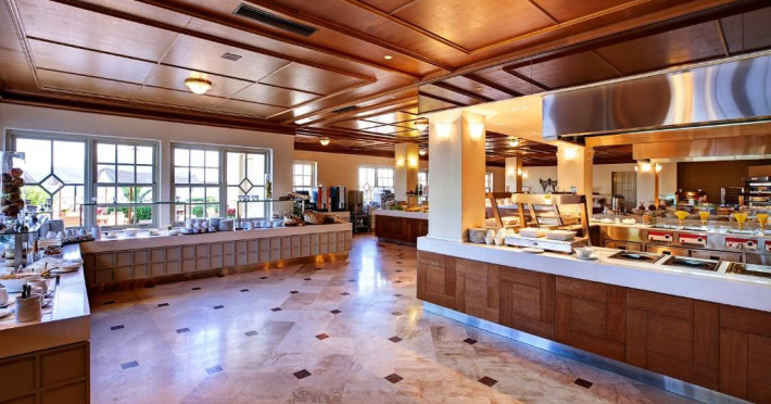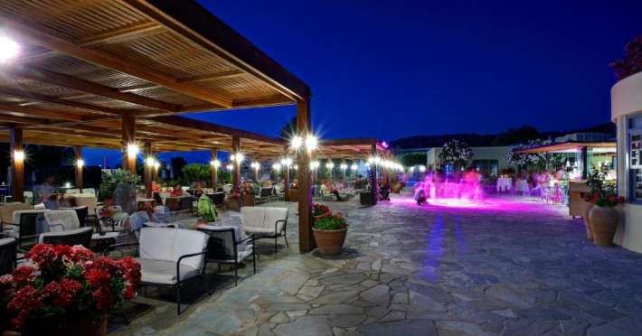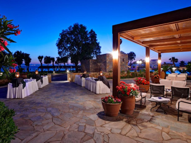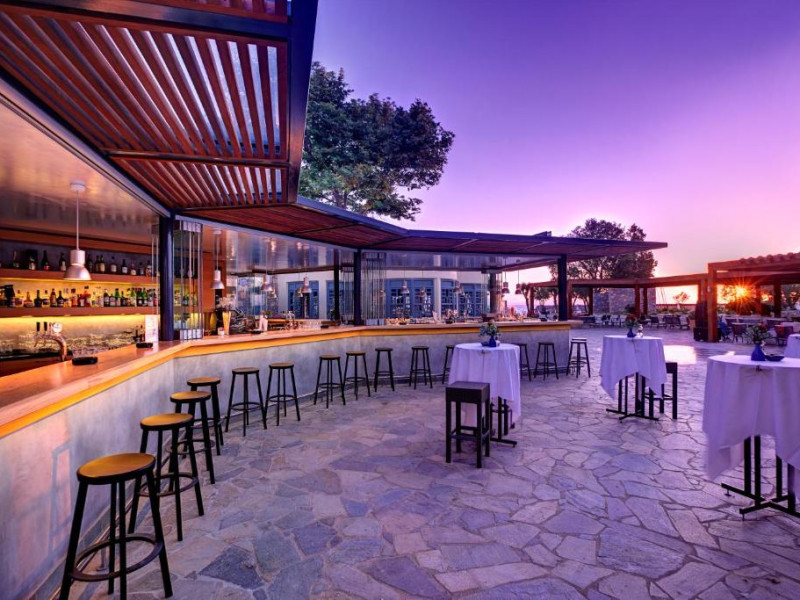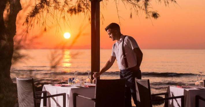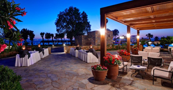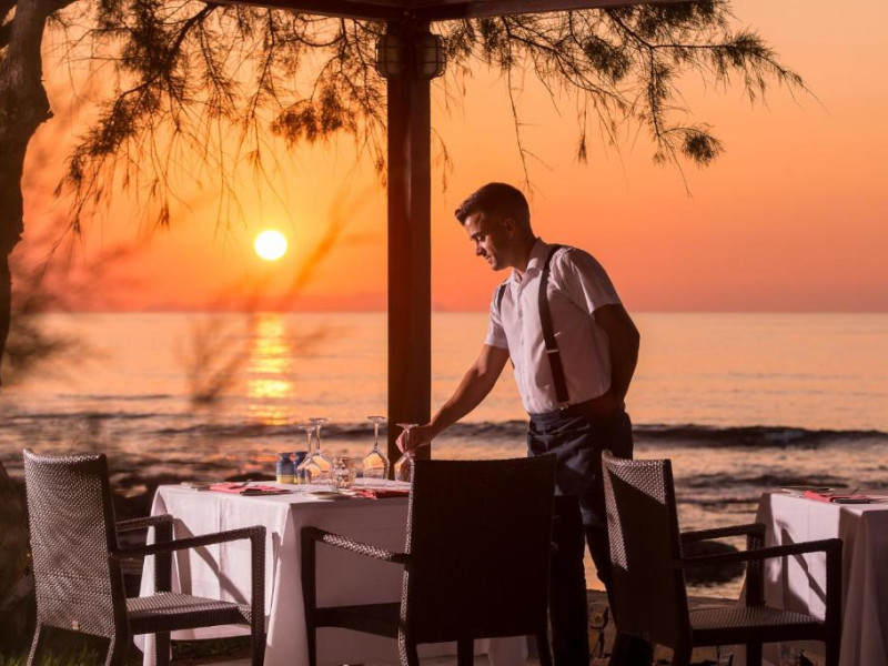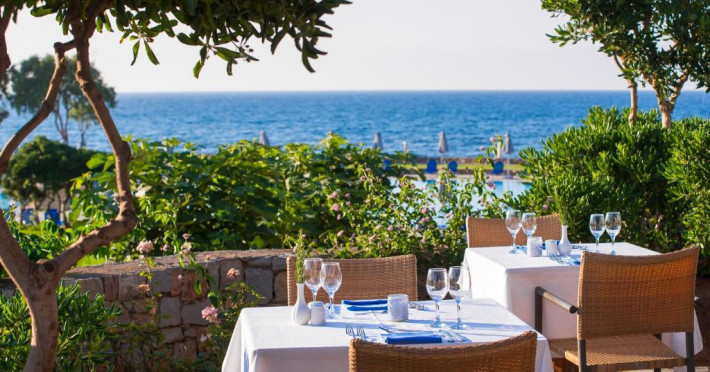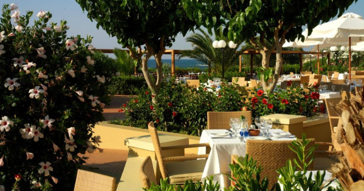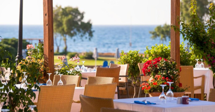 Restaurantul principal are vedere la mare și servește preparate mediteraneene și internaționale. Oaspetii pot savura băuturi, cocktailuri si inghetată intr-unul din barurile complexului, printre care se numără un bar amplasat pe plajă si o cafenea grecească traditională.