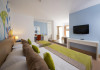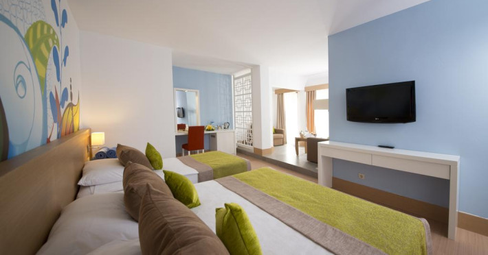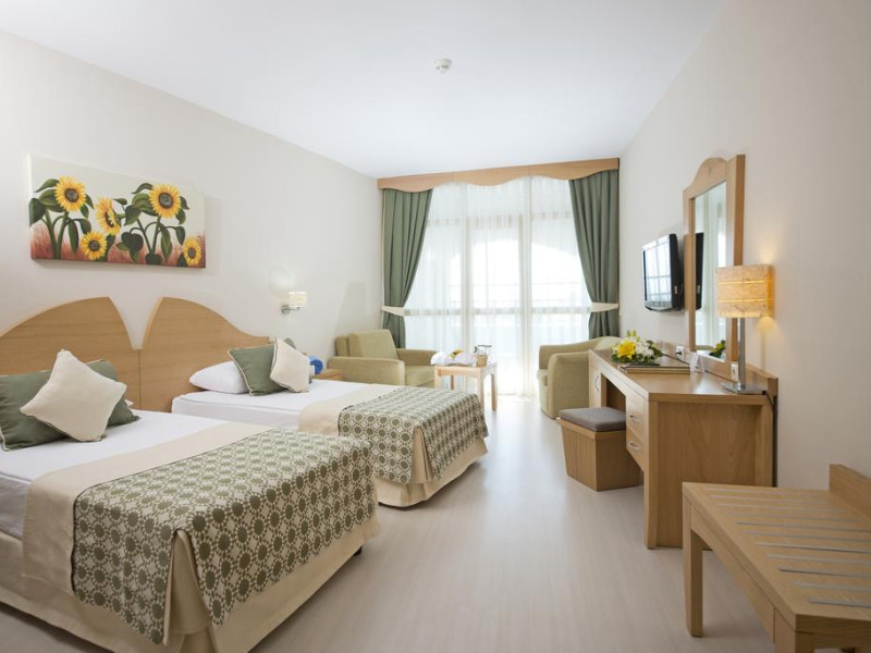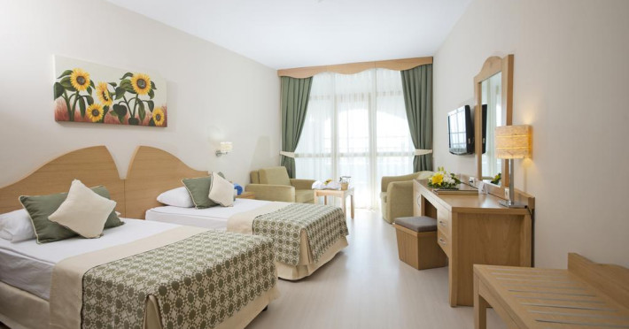 Hotelul are un numar total de 465 camere. Sunt 198 camere standard in cladirea principala (un dormitor, o baie, max 2+1pax), 173 camere standard in bungalow-uri (un dormitor, o baie, max 2+1pax), 12 camere family in cladirea principla si 79 camere family in bungalow-uri (45- 55mp, max 2+2pax), 3 Grand suits cu Jacuzzi in cladirea principala. Toate camerele au balcon sau terasa, vedere la mare sau la gradina, baie privata cu dus, cada si uscator de par, aer conditionat centralizat, telefon direct, mocheta, seif, mini bar (apa, bauturi racoritoare si bere - realimentat zilnic), TV satelit si canale de muzica, conexiune internet Wi-Fi.