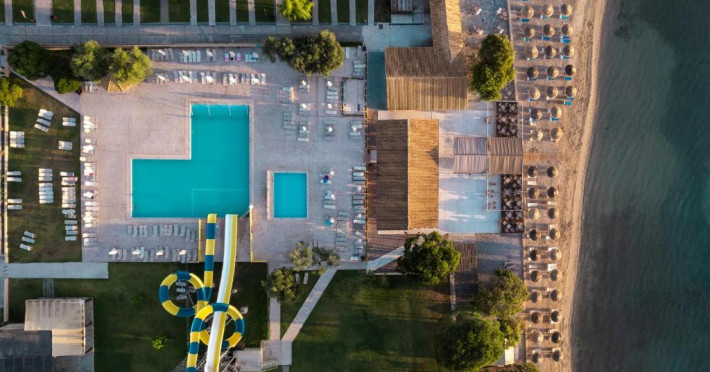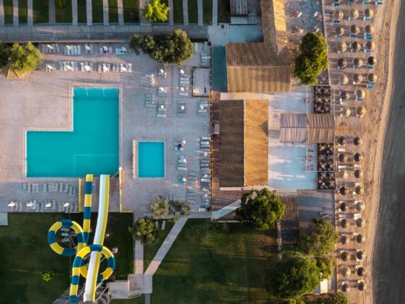 Complexul dispune de trei piscine exterioare, inclusiv una dedicată copiilor, restaurante cu specific internațional și grecesc, precum și multiple baruri unde puteți savura cocktailuri răcoritoare. Pentru cei activi, centrul de sporturi nautice și terenurile de tenis oferă numeroase opțiuni de divertisment.