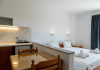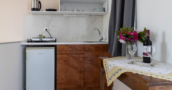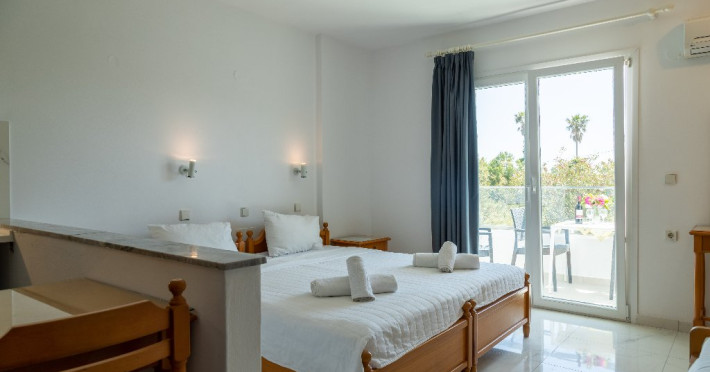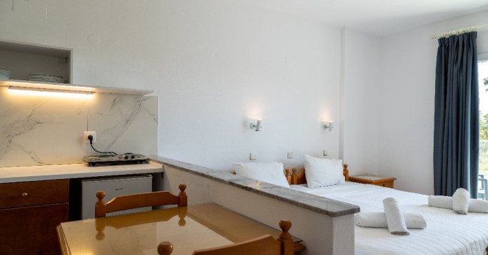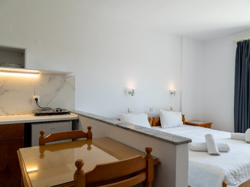 DOTARI CAMERE: Studiourile si apartamentele, mobilate simplu, includ o chicineta cu zona de luat masa. Fiecare unitate cu aer conditionat este dotata cu un frigider, arzatoare si fierbator electric. Baia privata este echipata cu uscator de par.