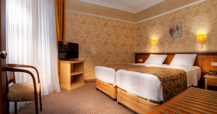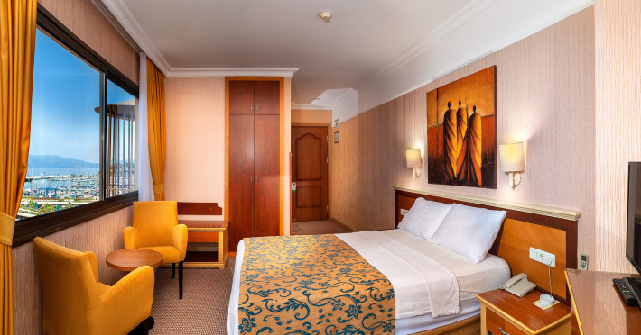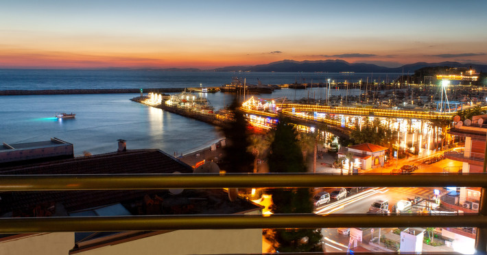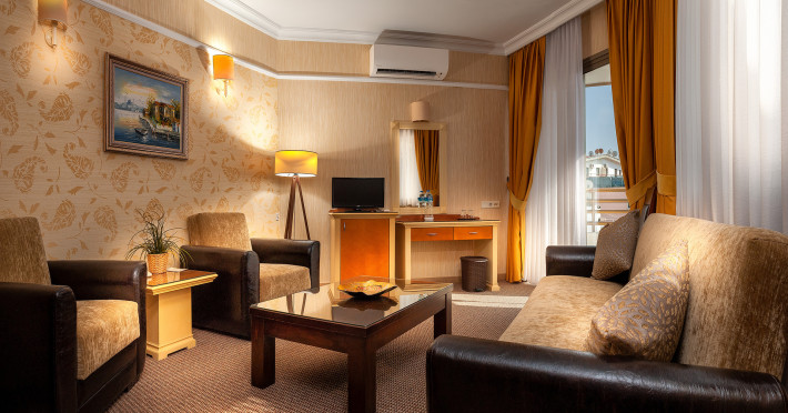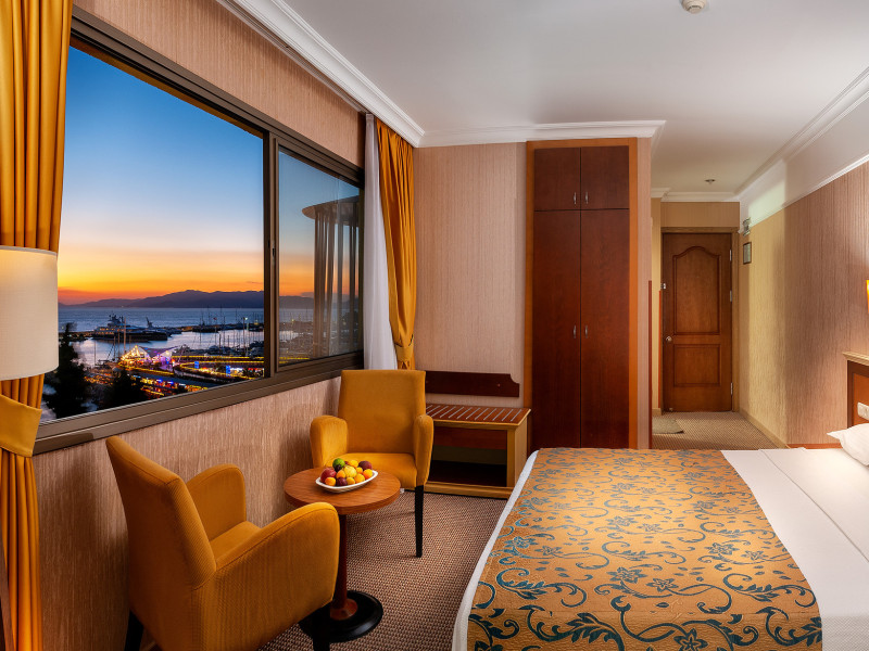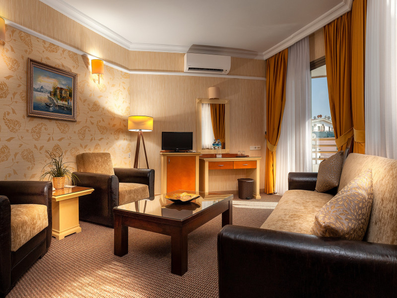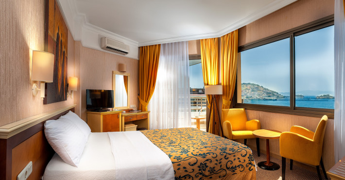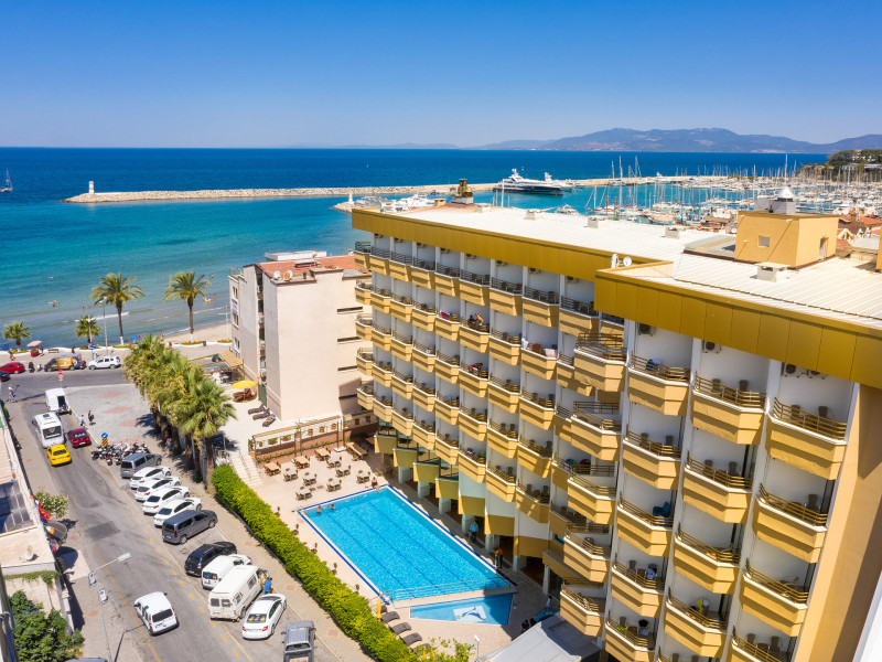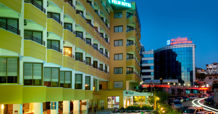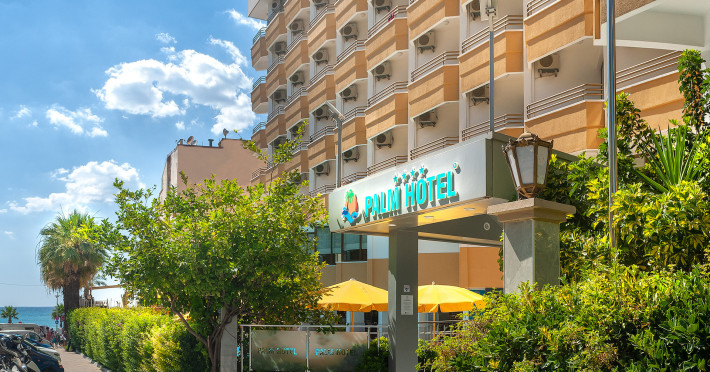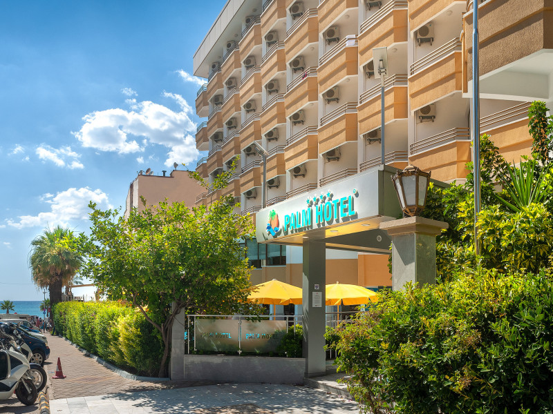 Just a few meters away from a public beach lies the hotel Palm Hotel. The nearest bars and restaurants are located directly next to the building. The old town is around 1 km away. You can find a range of shops and a supermarket directly on your doorsJust a few meters away from a public beach lies the hotel Palm Hotel. The nearest bars and restaurants are located directly next to the building. The old town is around 1 km away. You can find a range of shops and a supermarket directly on your doorstep. There is a shuttle service between the hotel and the airport. Nearby there is a disco which offers entertainment in high season. The beach is Pets are allowed here. Here, there are cushions available. The seasonally air-conditioned, GPS-verified hotel is equipped with a 24h reception (check-in is possible around the clock), a lobby, Wi-Fi, internet access, a lift, a jacuzzi, a first aid kit as well as a TV lounge with satellite TV. In the outdoor area of the property you will find a pool that is open seasonally. There is also a separate childrens pool with a non-swimming area. In addition, the hotel Palm Hotel is video-monitored 24h a day. For very young guests, highchairs can be provided. For the smallest children prams can be rented in the hotel. You can store your luggage in the hotels storage room. There is also a laundry service. For your comfort there is a concierge service. The energy supply is 220 Volts. For conventions and other business meetings, the hotel offers a conference area with a total of 50 seats as well as internet access. If you want to explore the holiday region, you can use the car rental service close to the hotel. In addition, the hotel sells tickets for excursions. In your hotel, a lot of focus is placed on sustainability. This includes among others organic food and ecological meals. Euro/Master Card and Visa are accepted as means of payment. Catering As catering services the hotel offers breakfast only. Breakfast is offered from the buffet. Enjoy your lunch as a set meal. For the meals, there are a restaurant (calorie-reduced, gluten-free and vegetarian dishes) and a bar as well as the pool bar. Distances Fun park: approximately at 5 km Cinema: approximately at 1 km Taxi rank: approximately at 150 m Port: approximately at 15 km Distance to the sea: approximately at 10 m Nearest dentist: approximately at 1 km Pharmacy: approximately at 30 m Hospital: approximately at 20 m Additional information The 5-storey hotel has a total of 70 rooms. This hotel is gay-friendly. The hotel staff speak English, German, French, Spanish and Turkish.