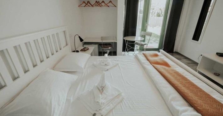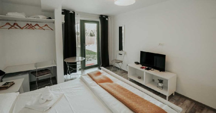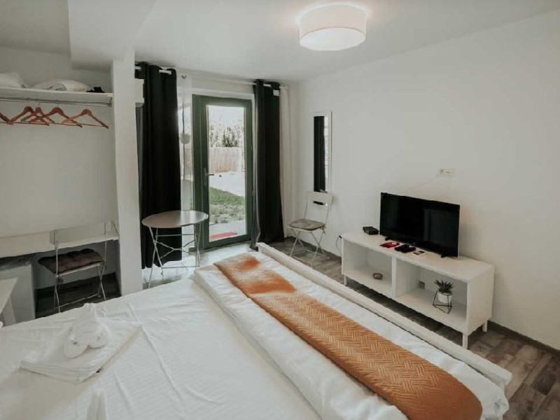 Camerele duble matrimoniale sunt spatioase si dotate cu mobilier nou printre care precizam: paturi matrimoniale cu saltele de calitate superioara (previ), noptiere, veioze, comoda tv, dressing, minifrigider, televizor, aparat de aer conditionat, mobilierul din camere fiind astfel ales cu grija.