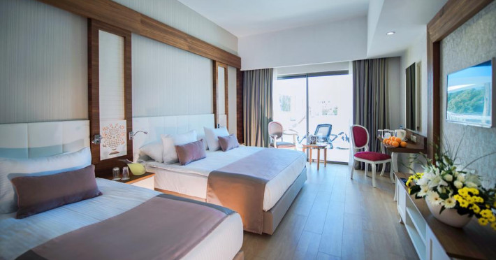 Hotelul are un numar total de 612 camere repartizate in 7 cladiri: camere Standard (34mp, un dormitor, o baie, max 3+inf; bebelusul trebuie sa doarma in pat cu parintii, nu exista posibilitate de adaugare a unui baby cot), camere family (40mp, doua dormitoare cu usa intre ele; o baie, max 4pax) si camere pentru persoane cu dizabilitati. Toate camerele au baie privata cu dus/toaleta, uscator de par, aer conditionat split, telefon direct, mini bar (realimentat zilnic cu apa si bauturi racoritoare), fierbator, ceai si cafea, seif , parchet laminat, TV prin satelit si canale de muzica, conexiune internet WI-FI, balcon sau terasa.