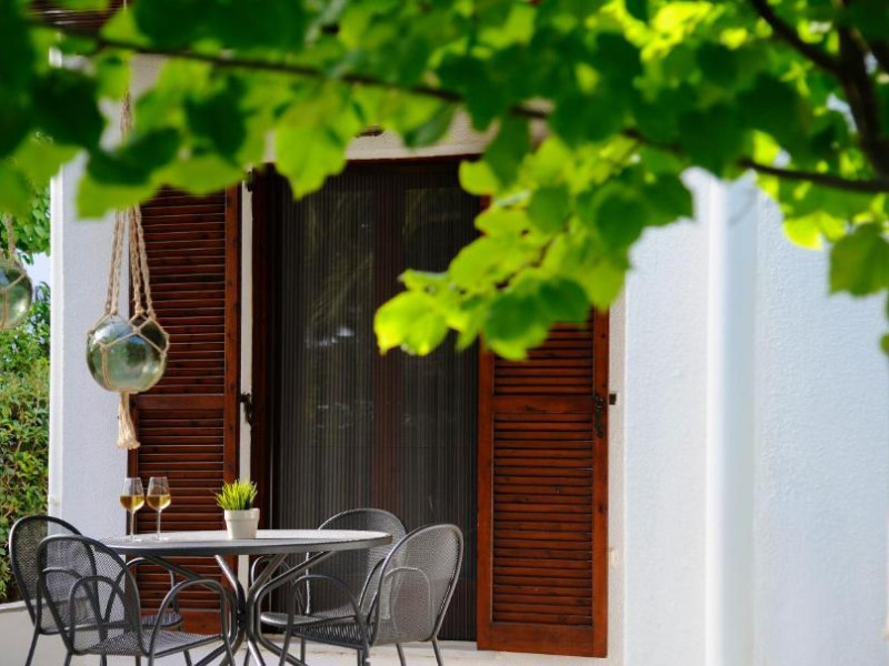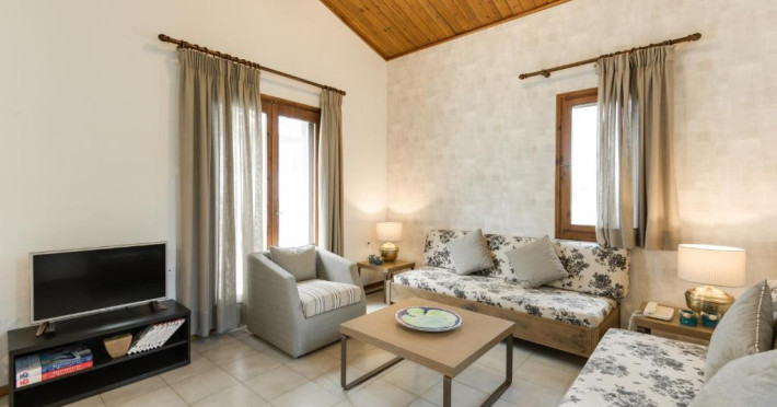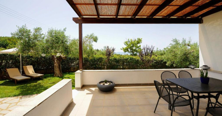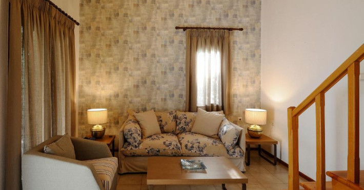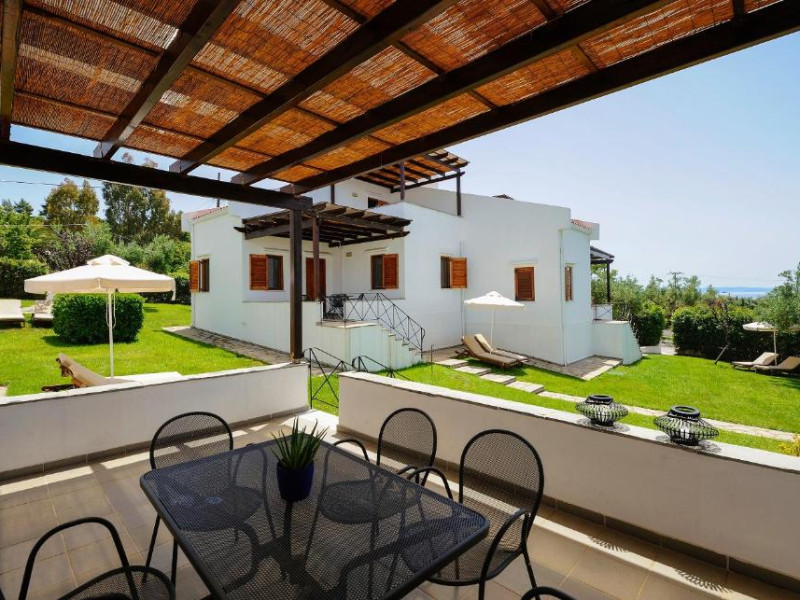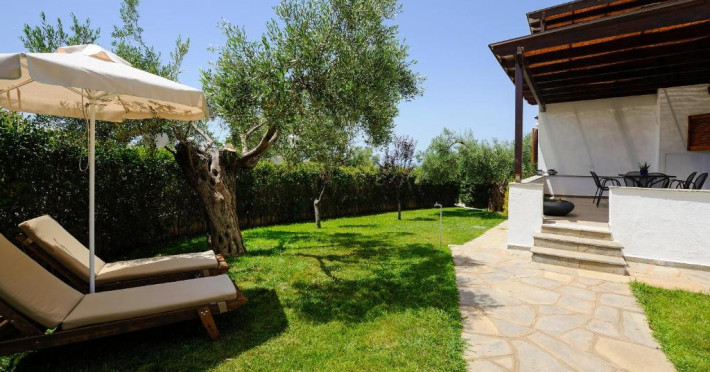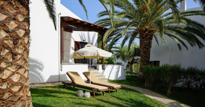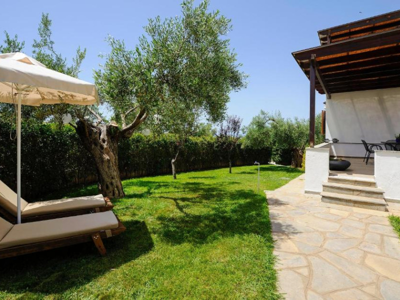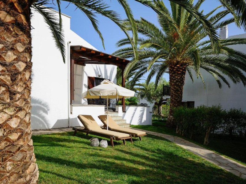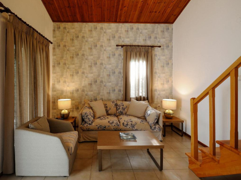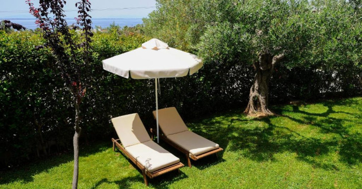 Terasele pavate cu piatra, cu acces direct la gradina, sunt umbrite cu pergole din lemn si ofera un plus de intimitate oaspete de la Trikorfo Beach. Elemente precum acoperișul cu țiglă, tavanul din mobilierul sculpat manual și oferă sejurului un plus de lux modern.