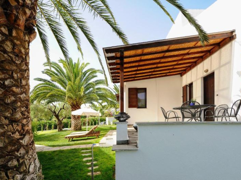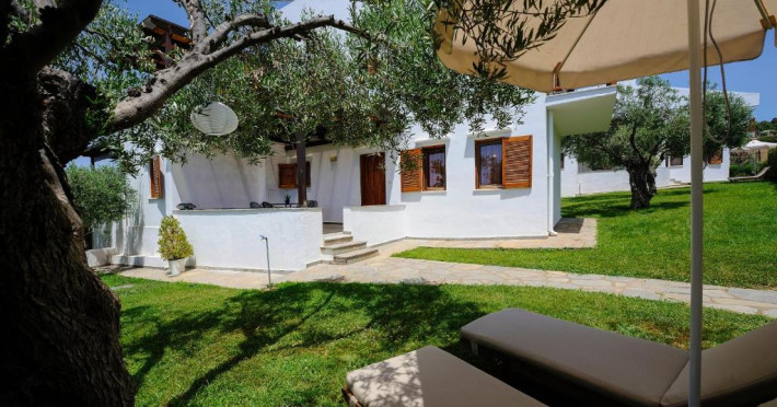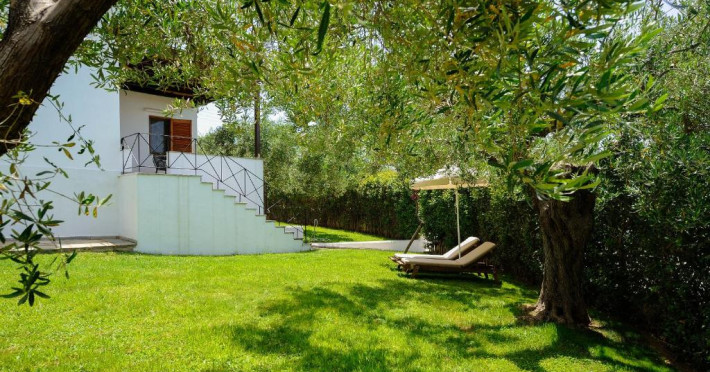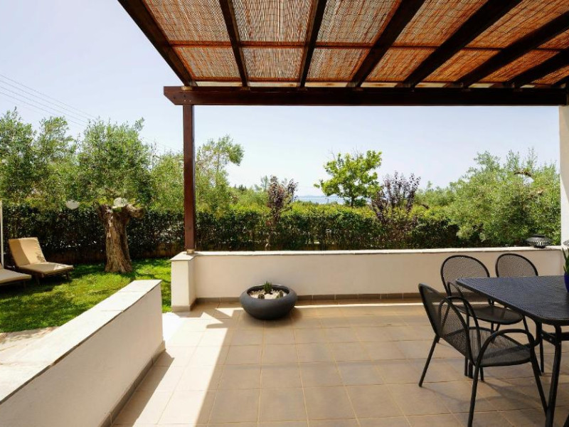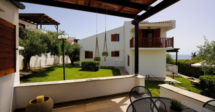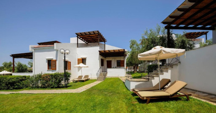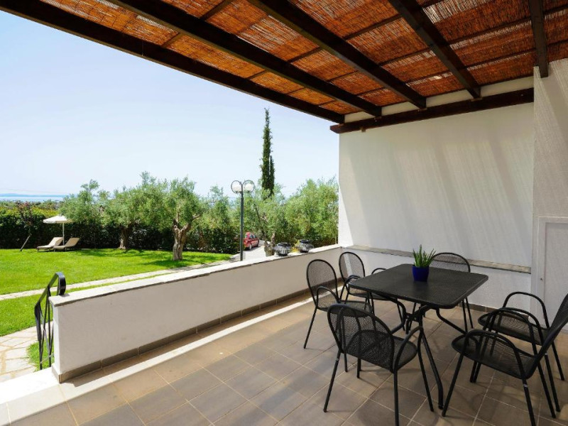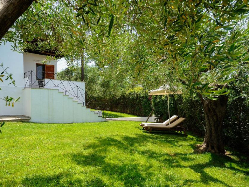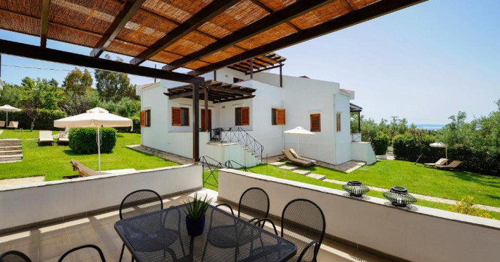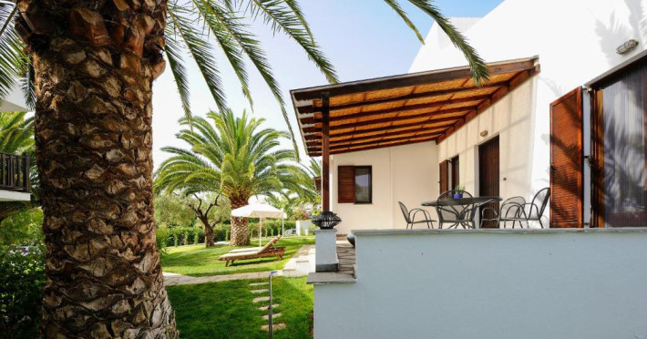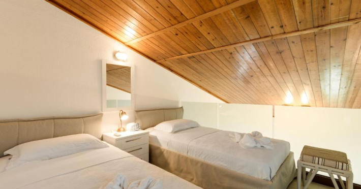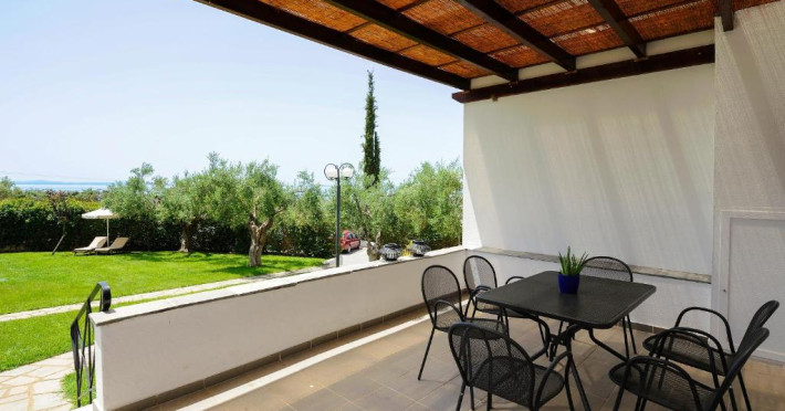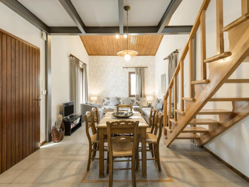 Terasele pavate cu piatra, cu acces direct la gradina, sunt umbrite cu pergole din lemn si ofera un plus de intimitate oaspete de la Trikorfo Beach. Elemente precum acoperișul cu țiglă, tavanul din mobilierul sculpat manual și oferă sejurului un plus de lux modern.