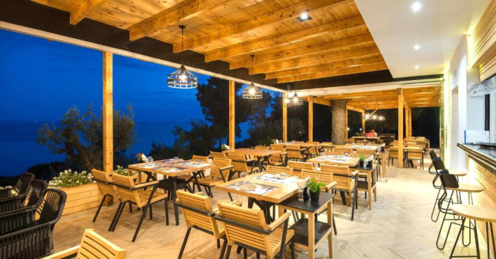Restaurantul servește micul dejun, mezedes grecesc cu ouzo și un meniu bogat cu pește proaspăt și specialități locale. Oaspeții pot savura gustări și băuturi pe plajă amenajată, relaxandu-se pe un șezlong la umbra unei umbrele de soare.