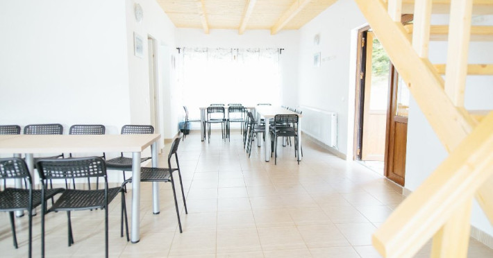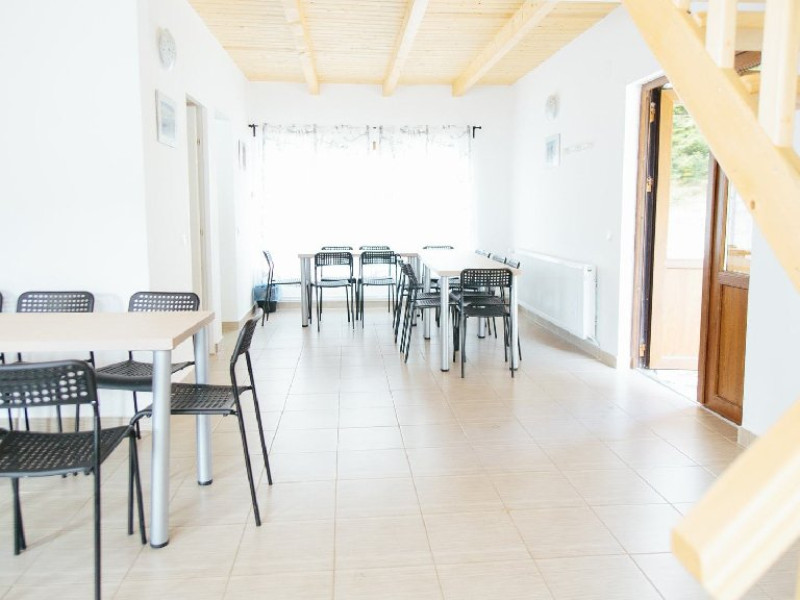 Vila 3 are in parte a de jos o bucatarie comuna pentru toata cele 3 vile si un living cu scaune si mese pentru 30 persoane.