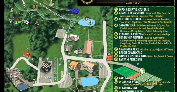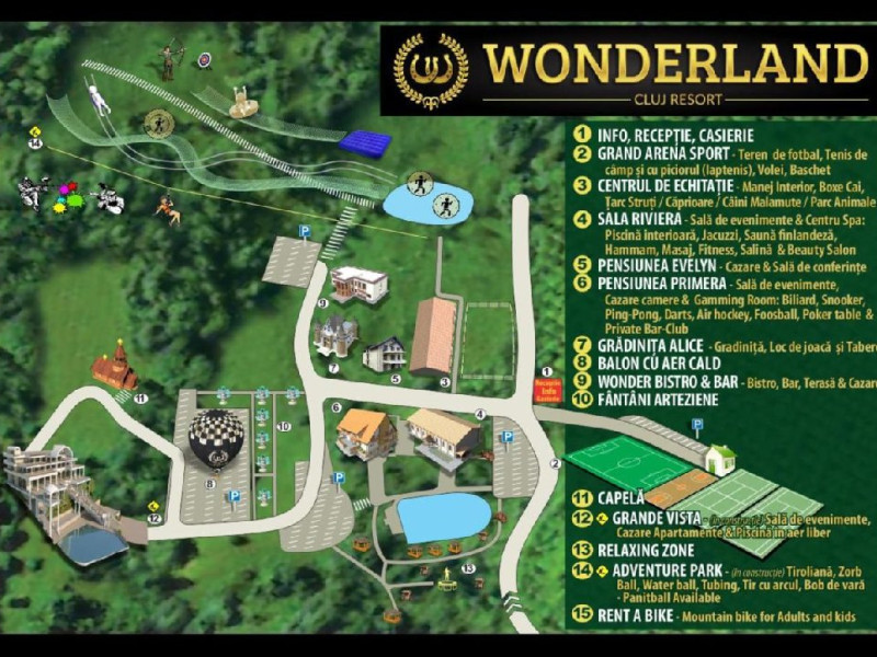 Wonderland Cluj Resort este situat la doar 7 km de oras vechi din Cluj-Napoca si pune la dispoziita oaspetilor o piscin, un centru spa, facilitti de echitatie si o teras cu vedere la lac. Este disponibil acces gratuit la internet WiFi. Camerele sunt decorate elegant in nuante calde deschise. Acestea includ TV cu ecran plat cu canale prin cablu si baie privat. Restaurantul a la carte serveste preparate din buctria local si interntional. Oaspeti se pot relaxa la bar si in grdina comun sau la centrul spa, Serviciile de masaj sunt disponibile la un cost suplimentar. De asemenea, oaspetii pot inchiria biciclete si pot explora dealurile din apropiere. Wonderland Cluj Resorts pune la dispozitie si facilitti de banchet. Proprietatea are receptie cu program nonstop. Orasul Turda se afl la 26,8 km de proprietate. Aeroportul International Avram Iancu Cluj este situat la 18,5 km. La complex este disponibil o parcare public gratuit.