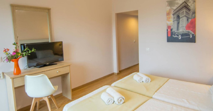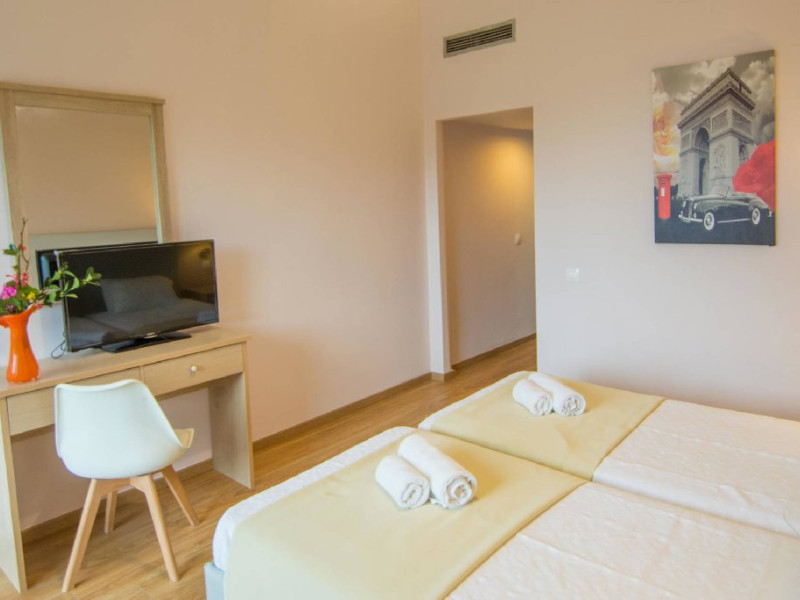 Hotel Hotelul dispune de 95 de camere de diferite tipuri, dispuse intr-o cladire cu 4 etaje. Patut pentru copil sub 2 ani gratuit (la solicitare, in rezervare). Receptie si lobby pentru oaspeti, lift. Piscina cu terasa insorita si sezlonguri, bazin pentru copii, prosoape pentru piscina disponibile (depozit 10 EUR/buc).