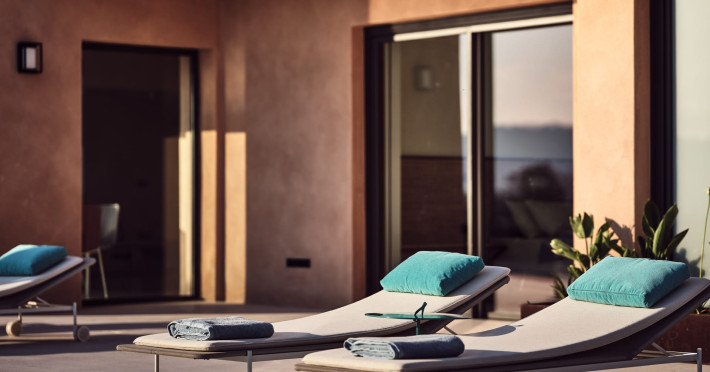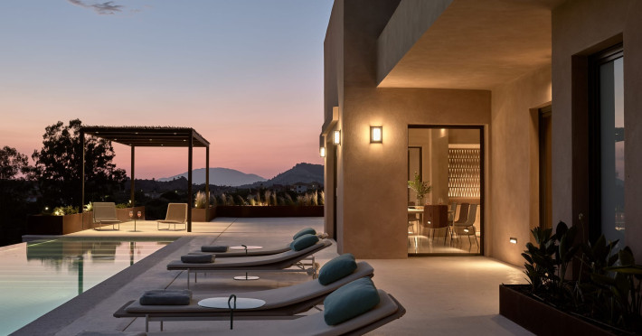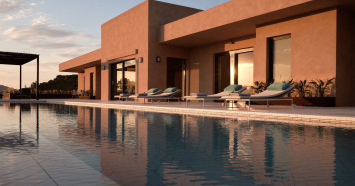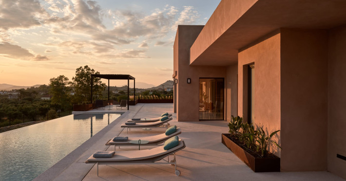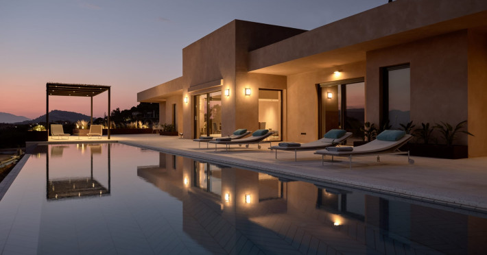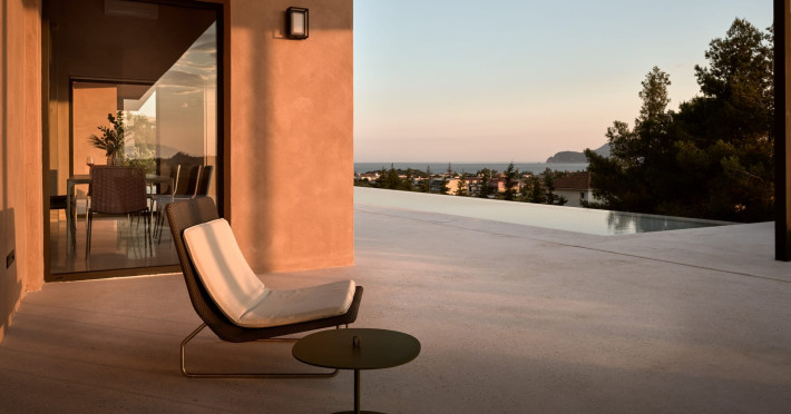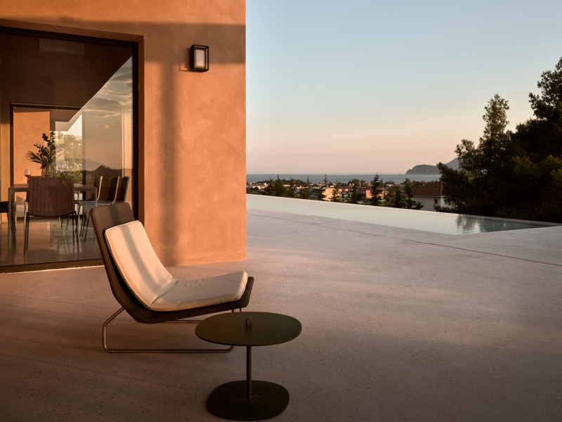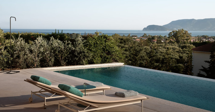 Villa Astrea is situated in a serene location on the south of the island of Zakynthos, above the famous Bay of Laganas and only a short 1.5 km from the sandy beaches of Kalamaki and also Laganas within the protected marine park (the largest nesting ground for careta careta turtles in the area). This unique architect designed villa is set in the peace and tranquility of the gentle hillside, while its elevated position gives spectacular views across the bay and the hinterland beyond.