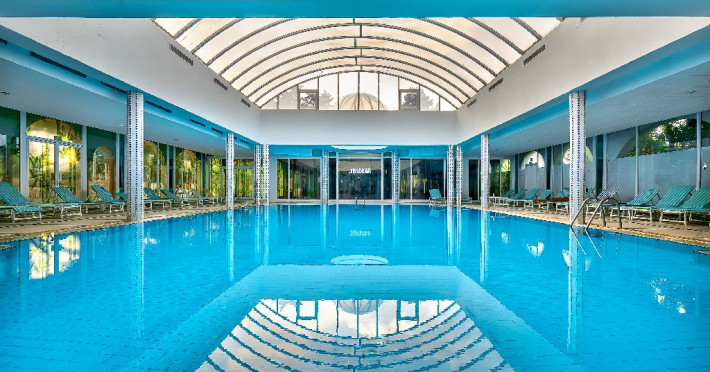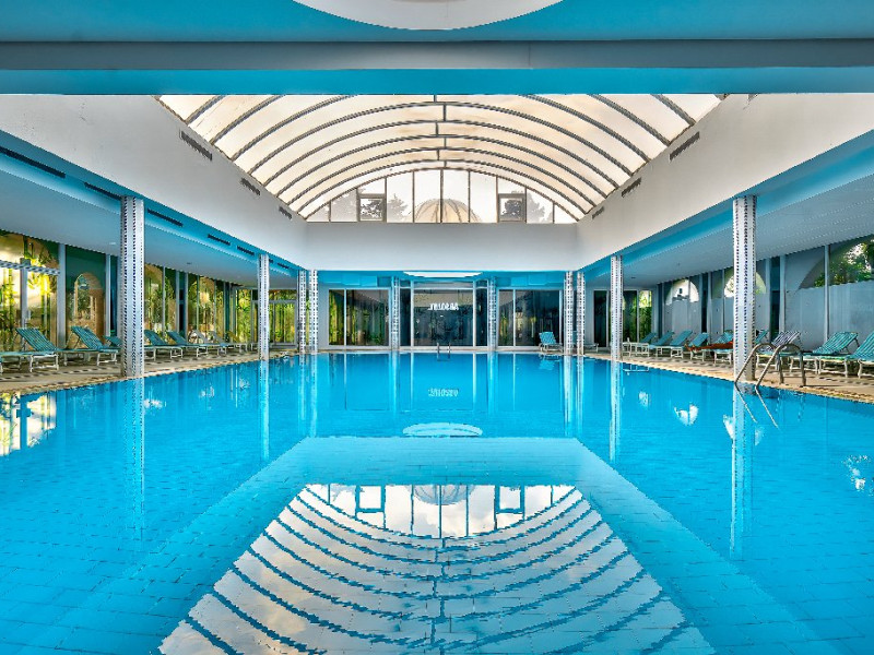 2 piscine cu apa dulce (exterioara si interioara cea interioara functioneaza in sezonul de iarna), piscina pentru copii, sezlonguri si umbrele.