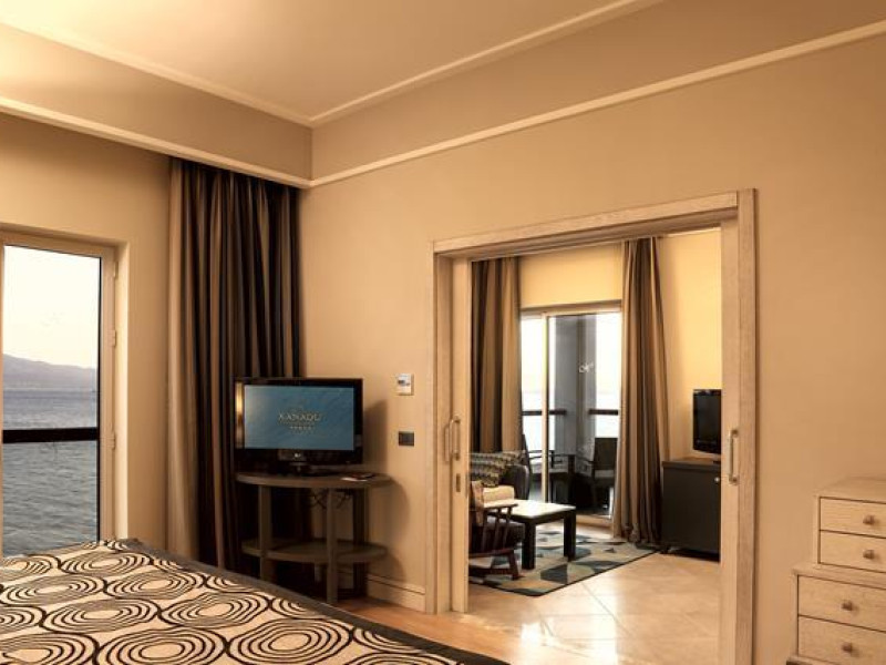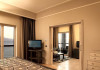 DELUXE SUITE : in garden One-bedroom suite with entrance hall, furnished balcony, bedroom with kingsize bed and living room with twin sofa sleeper separated by double French doors, large bathroom with shower, bath, sink, toilet.